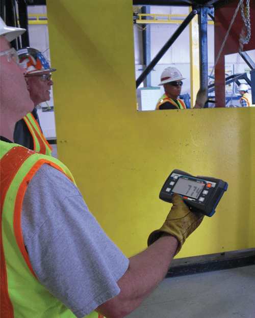 Enclosure: NEMA Type 4, IP65Weight: 0.98 lb (445 g) Keypad: On/Off, Zero (100%), Tare, Print and two user-defined keys for the following functions: peak hold, high resolution, total, view total, net/gross, units switching Display: Six-digit 1.0 in (26.4 mm) LCD screen Units Displayed: Pounds, kilograms, tons, metric tons, kilonewtons | Annunciators: Stable, COZ, low battery, peak, net, kg, kN, lb, M, ton, setpoint, function LEDs Power: Integral lithium-ion battery Universal 115/230 VAC, 50/60 Hz battery charger (NA plug included) Operating Time: Up to 24 hours of continuous use (15 minute auto-shutoff with non-use) Operating Temperature: -4 °F to 140 °F (-20 °C to 60 °C) | RF Radio Link: 2.4 GHz 802.15.4 Communicates with RF 3460, 4260, 7300, 7000 & 7001 RF Effective Range: Typically 100 to 300 ft, line of sight; for longer range consult factory Connector: Four-pin Turck connector for charging and RS-232 communication Warranty: One-year limited |